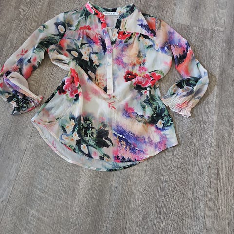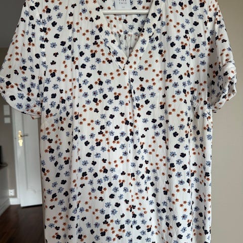 Blomster mønster, lyseblå / støv blå bakgrunn og orange og hvitt i blomster, pent brukt ett par ganger, strykefri, polyester stoff,