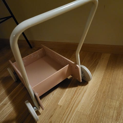 Klassisk gåvogn fra Micki i tre med bremseutstyrte, PVC-frie hjul. Den har et justerbart håndtak. Gåvognen gir stabil og trygg støtte til barnets første skritt.