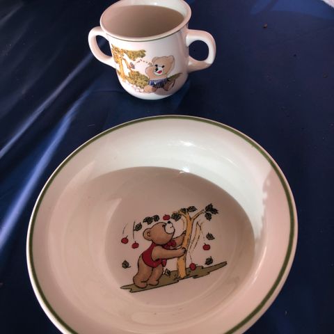 Lite brukt frokostsett i porselen til barn med tallerken (20x20 cm), skål og kopp. Ingen skader.