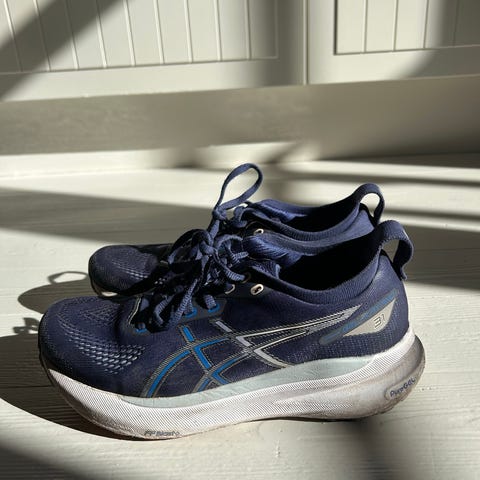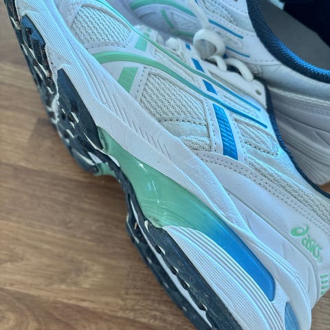 Asics Sneakers joggesko i størrelse 39, farge blå med grønne detaljer. Skoene er laget i tekstilmateriale med gummisåle. Passer til daglig bruk og løping.