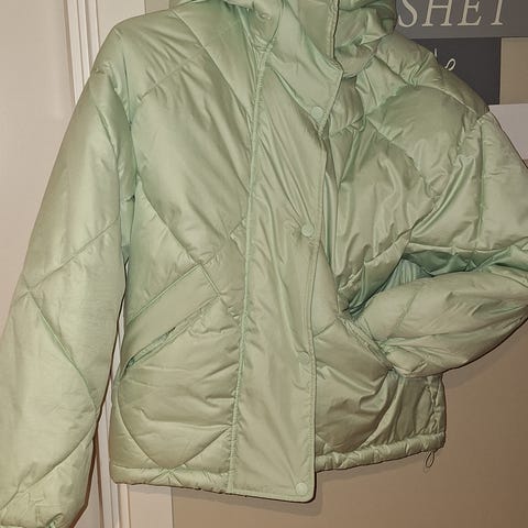 Divided Collegejakke i størrelse xxs men den fremstår mer som en XS-S. Jakken har beige ermer og en rutete mønstret kropp med knappelukking foran. Jakken er myk og lett fôret, og veldig behagelig.