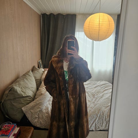 Svært god og varm pelskåpe selges billig da den sjelden blir brukt. Lekkert lærlignende belte og hemper til festing. Hette for å kunne beskytte håret ute.