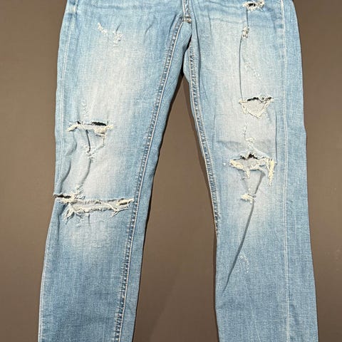 Zara blå jeans i størrelse S med midjevidde W25, designet for kvinner. Laget av denimmateriale, med klassisk fem-lommers design og knappelukking. Passer til daglig bruk og ulike anledninger.