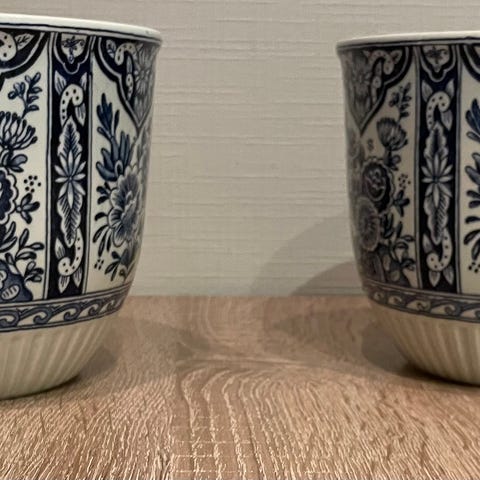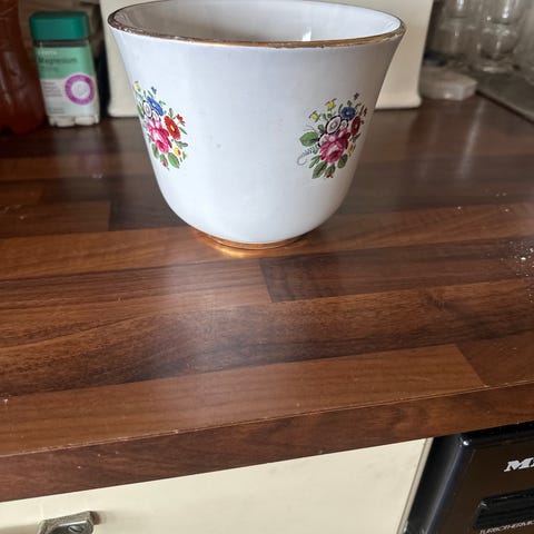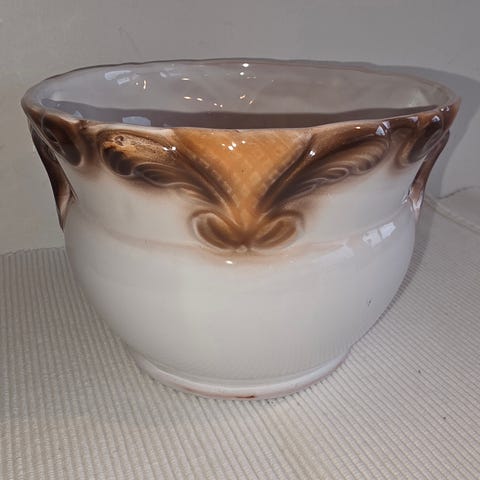 Pen eldre pynte potte til blomster. Elfenben farge,,,. 15 cm. i diam. og 13 cm. høy.. Litt mørk i bunnen, Ellers i fin stand..