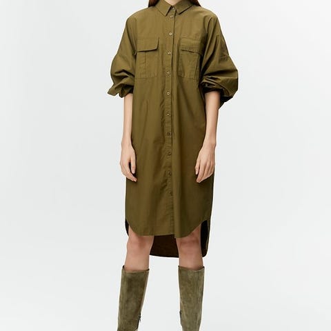 Knelang kjole med lange ermer, lommer og skjortekrage.