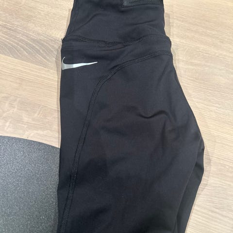 Nike Dri-FIT løpebukse for dame i størrelse S. Buksen er svart og laget med Dri-FIT teknologi som transporterer fuktighet for bedre komfort under trening. Egnet for løping og annen fysisk aktivitet.