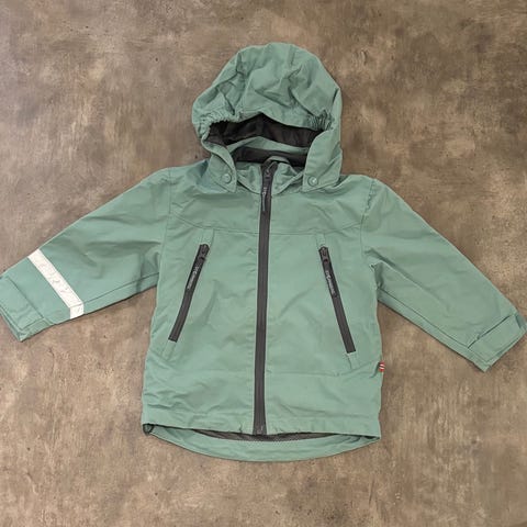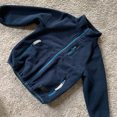 Blå fleecejakke til barn som er vindtett. Denne er fin til å bruke sommer, vår og høst på vindfulle dager. Jakken er pent brukt.