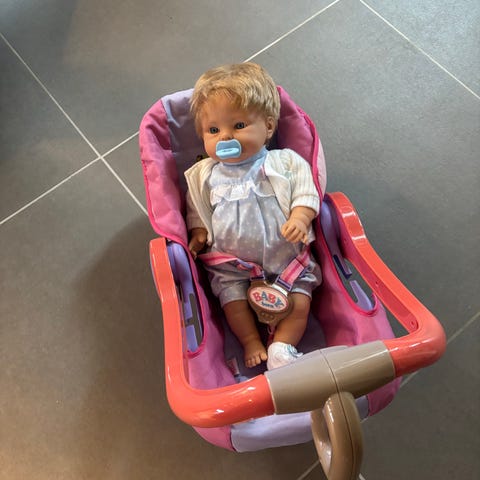 Rydder i leker som ikke blir brukt: Dukke 50cm og bilstol, pent brukt kr. 80,-