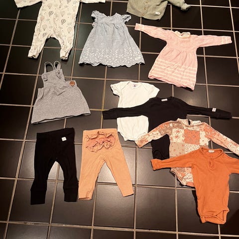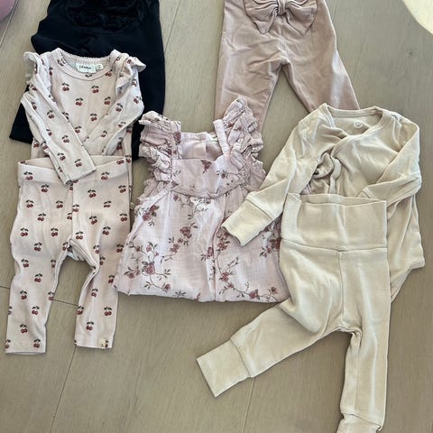Pent brukte klær uten hull eller merker. 2 bodyer, 2 gensere og 2 bukser. Leopardbuksen er i str 98, men er brukt som et sett med bodyen i str 92.