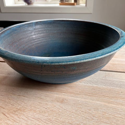 Selger et håndlaget keramisk kakefat på stett i dyp blå glasur.