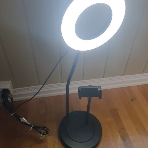 Meget lite brukt. Som ny. Ringlys med ulike lyssettinger for lysstyrke og varmt eller kaldt lys. Kan stilles inn i ulike høyder. Fjernkontroll. Plass til mobil inni.