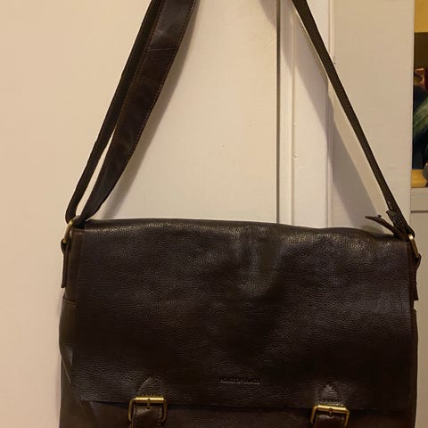 PC veske i svart skinn- lær, designet for unisex bruk. Vesken har to håndtak og en avtagbar skulderrem, samt flere lommer for oppbevaring. Innvendig er vesken foret med stoff og har ekstra rom for organisering av eiendeler.