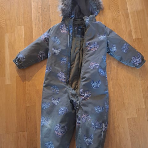 Name it Vinterdress i størrelse 104. Brukt i 2 sesonger. Noe slitasje på venstre kne på print, men ingen hull. Fotstrikken er byttet. Sømmen ved glidelåsen hadde åpnet seg. Reparert med noen stikk.