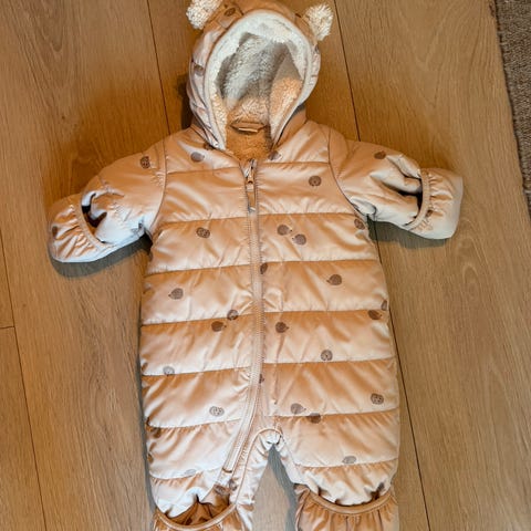 Deilig heldress i teddystoff. Hette, føtter og votter i dressen. Litt stor i str så denne brukte vi mer mot str 62. Hel og fin, ingen anmerkninger. Røyk og dyrefritt hjem