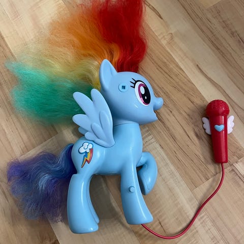 Stor syngende Rainbow Dash med solbriller og mikrofon.