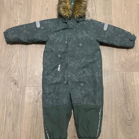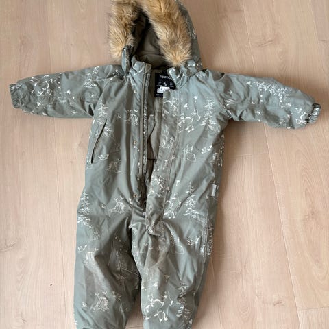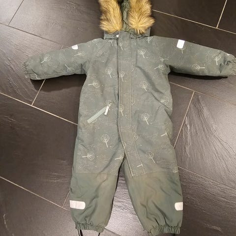 I størrelse 86. Avtagbar hette og fuskepels. Dress som passer fint til vinterbruk, er varm og god.