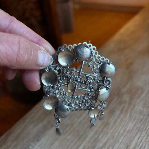 Selger en stor sølje til Hardangerbunad i sølv. Høystbydende over 1500 kr.
