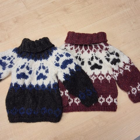 Villmarksgenser str 2 år, strikket i 100% ull som ikke klør. Aldri tatt i bruk.