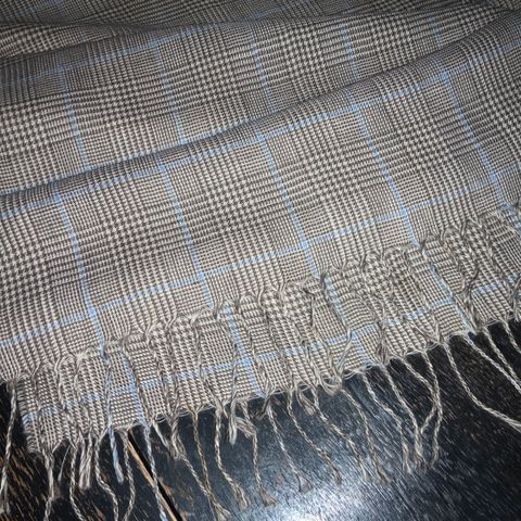 Fint skjerf i deilige farger, med brunt som hovedfaget. Blandingsmateriale, mest ull.