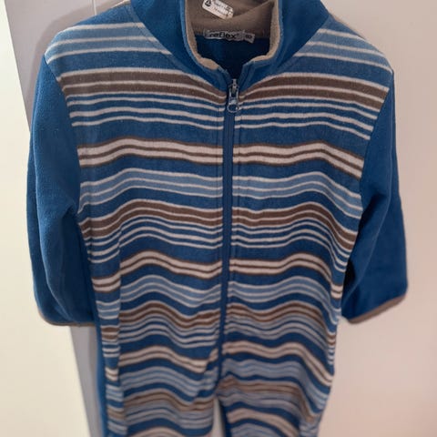 Tynn kjeledress med fleece inni. Godt brukt, noen nupper, noe flekker(ikke prøvd å vaske bort) ellers mye bruk igjen. Ingen synlige hull.