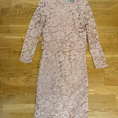 Hale Bob Festkjole i størrelse M og beige farge. Kjolen har lange ermer, blonder og dekorative detaljer foran med snøring. Materialet er delikat og egnet til formelle anledninger.