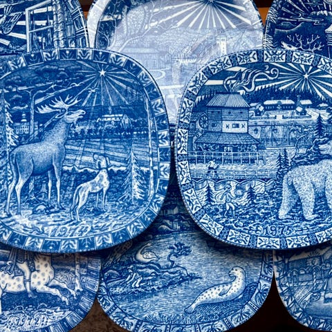 De 12 koppene med skål er det originale Louise Adelborgs Nationalservise med gull i midten på fat og gull på hanken.