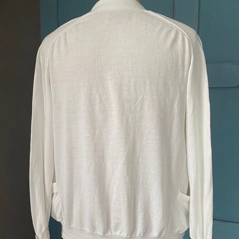 Vintage Acne Studios strikket jakke i tynt gull/beige garn . Den er gjennomsiktig, med noe skimmer. Størrelse S, men passer nok fint en strl M.