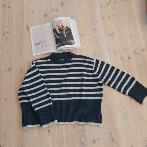Myk og lodden genser i ullblanding selges, strikket etter mønsteret "Cala" fra Camilla Pihl. Rullekant i halsen, ballongermer og raglandsfelling v/skulder.