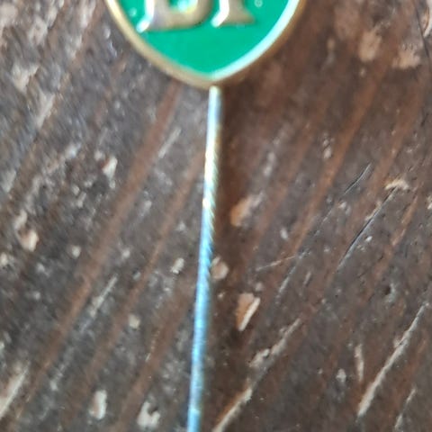 BP pin metall, grønn og gullfarget.