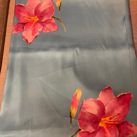 Lys blå/turkis stoff. 3.00m langt og 1,20m bredde. Veldig fint til fest.