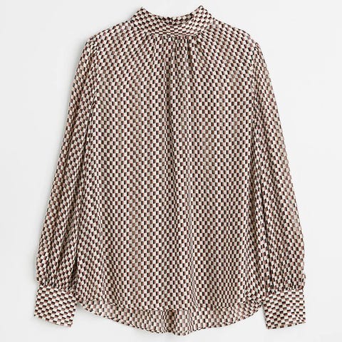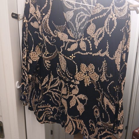 Pen bluse i tynt stoff. Har en rynkete struktur. Mange morsomme detaljer, som for eksempel forskjellig knapper. Ermene i kontrastfarge med knytting. Veldig original og unik bluse som ble hengende i skapet. Ikke brukt. Prislappen er fremdeles på. Eksklusiv. Kostet opprinnelig over 1350,-