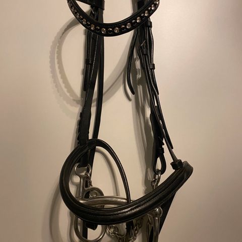 Hodelag i størrelse full, sprenger bitt, 3 delt str 11,5. Pannereim og tøyler følger med. Er brukt. Trenger litt ekstra pussing.