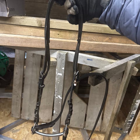 Hodelag med skinntøyler, bling-pannereim og bitt