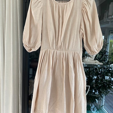 by TiMo i beige farge, størrelse XS. Kjolen har detaljer som puffede ermer, elastisk midje og volang nederst. Laget av kordfløyel materiale.