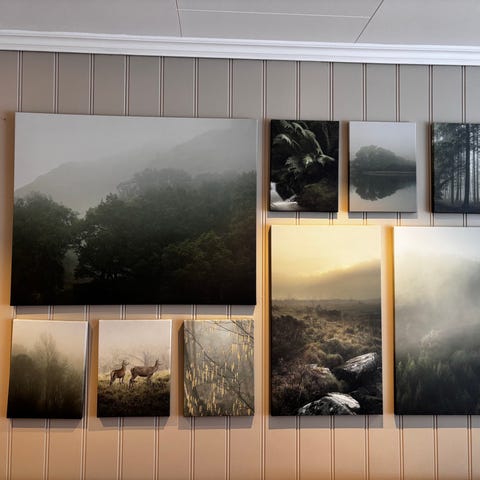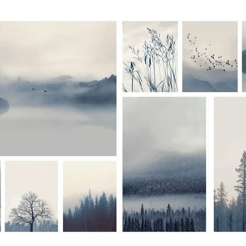 IKEA dekorative veggbilder med naturmotiv i duse farger. Sett bestående av flere bilder i ulike størrelser som viser skog, trær, vann og landskap. Bilder egnet for veggdekorasjon i stue eller andre rom.