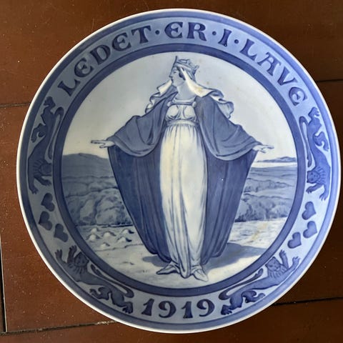 Samletallerken - Konunga Mötet Malmö 1914, porselensfat med blått og hvitt med det Norske, Svenske og Danske våpenskjolden. Fatet er fra Rörstrand og er numerert, og uten skader.