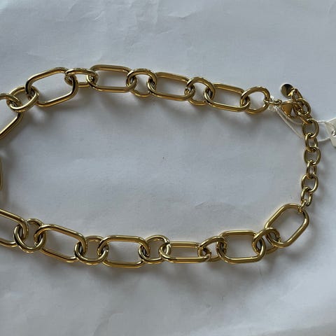 Selger et stilfullt armbånd i gullfarge med ovale, sammenkoblede lenker og teksturert overflate som gir et eksklusivt preg.