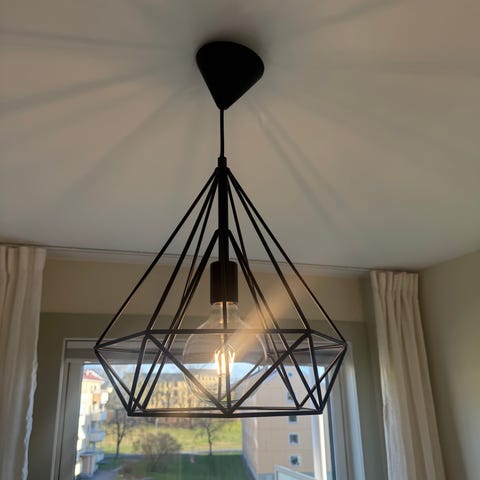 Taklampe fra Lampehuset selges fordi vi har fått ny lampe. Lampen har en diameter på 35 cm, og den henger 68 cm ned fra taket. Pære er ikke inkludert. Kan sendes med Posten/PostNord, kjøper betaler frakt. Kan også leveres i Bergen-området."