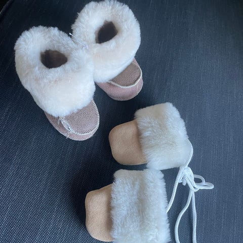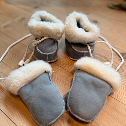Nesten ubrukte votter og tøfler. Veldig fin lyseblå farge. Usikker på størrelse, men tøflene er ca. 11cm.