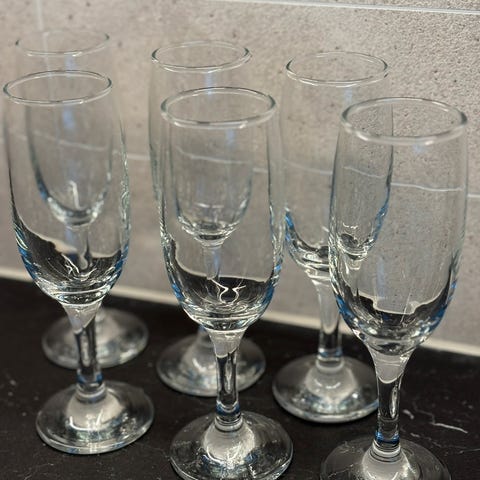 Selger 6 stk champagneglass av ukjent merke. De er pent brukt. De er tykke og veier litt mer enn de tynnere glassene.