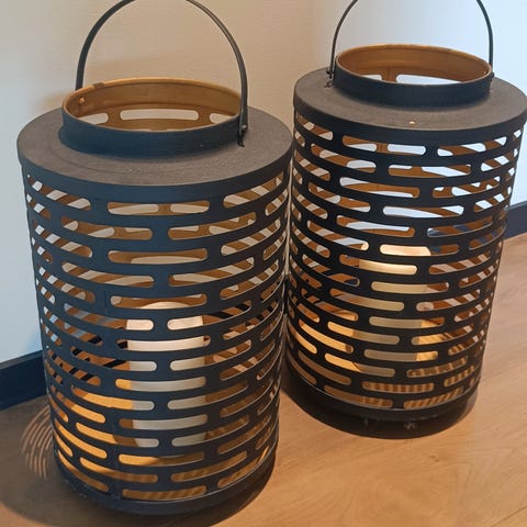 Lykter i metall med hullmønster, gullfarget. Kan brukes som lyslykter eller dekorative beholdere. Kan også brukes som vaser. Vi har brukt som vaser.