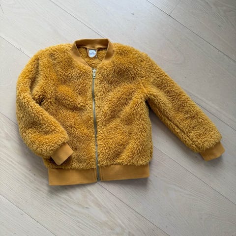 Lindex Barn Jakke i størrelse 80, gul farge, laget av 100% polyester. Jakken er unisex og egnet for barn. Materialet er mykt og har en fleece-lignende tekstur som gir varme og komfort.