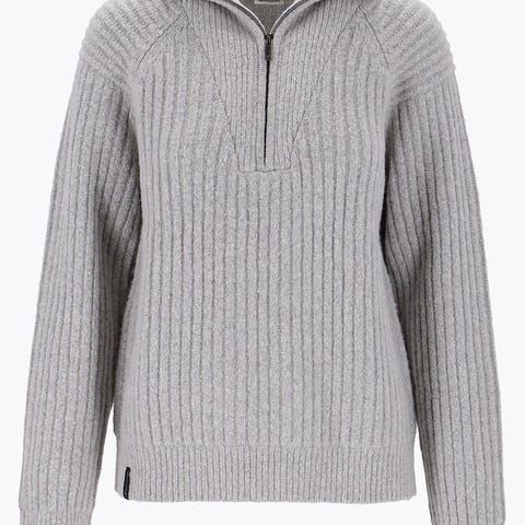 Twentyfour Genser for damer i størrelse One Size. Genseren er grå og har en strukturert strikk med mønster. Materialet er ikke spesifisert. Genseren har en kort glidelås ved halsen og et merke på ermet.