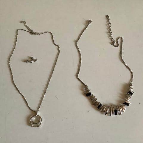 Smykkesett bestående av flere sølvfargede kjeder med ulike design, inkludert kuler og flate lenker. Materialet er metall med sølvfinish. Passer som tilbehør for ulike anledninger. I