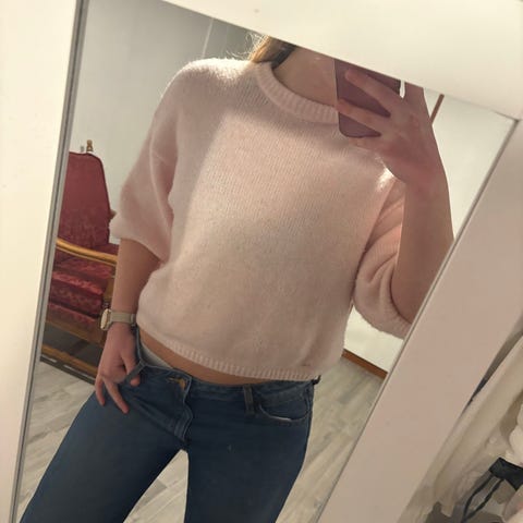 Kortermet strikket genser med rund hals. Genseren er rosa og har myk kvalitet. Den har en oversized passform og ribbestrikk ved ermeslutten og i nedre kant.