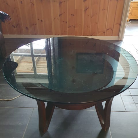 Meget pent rundt bord. Sotet glass, uten hakk, riper eller synlig slitasje. Svært pent mørkt treverk, noe slitasje nederst på ben. Et bord som fint kan kombineres i både moderne, vintage og retro stil.