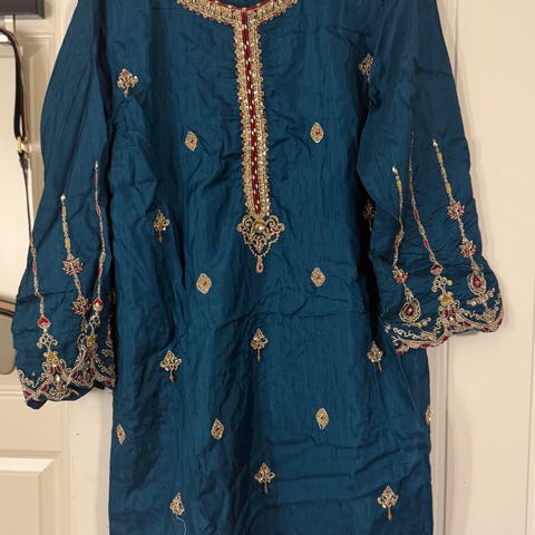 Pakistansk kjoler for kvinner i størrelse 44. Kjolen er grønn og har broderte detaljer i front med røde og beige farger. Materialet er ikke spesifisert. Kjolen har lange ermer og knappelukking foran. Passer til hverdagsbruk eller andre anledninger.