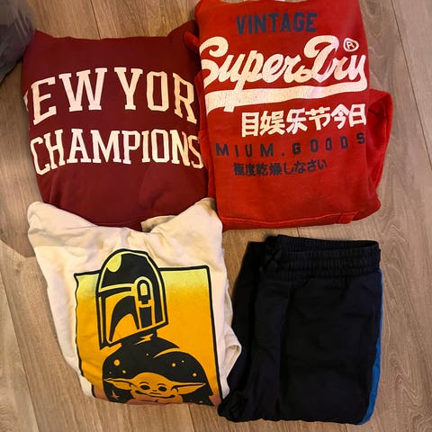 Klespakke til jente ca 12-14 år. To stripete bukser i str 170, 14 år. Den ene er lett og luftig fra Lindex med strikk og knyting. Den andre tykkere i stretch. Begge med lommer. En Tik Tok hettegenser med ører, kort i livet, som ny. En burgunder genser med mønster fra Cubus. Smale ermer og passer derfor S/XS eller barneermer.