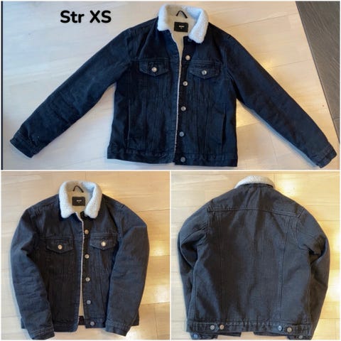 Kul svart/grå denimjakke med varm, kremfarget teddykrage og vattert fôr.