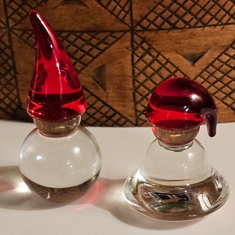 2 nisser med rød lue i glass til salgs.